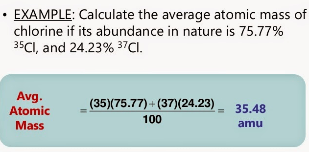 Average atomic mass of chlorine = (0.7577 ⋅ ⋅ 35 amu) + (0.2423 ⋅ ⋅ 37 amu) = 35.48 amu. Though technically incorrect, the term is also often used to refer to the average atomic mass … To find the atomic mass of chlorine, the atomic mass of each isotope is multiplied by the relative abundance (the percent abundance in decimal form) and then the individual masses are added together... Mass of one atom of an elements called atomic mass.